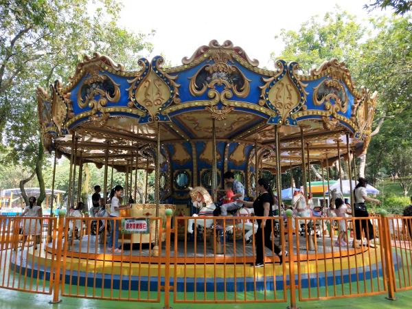 24座豪華轉馬中央有起伏奔跑的大小馬群。設備啟動后,金光銀光,閃閃相映,馬群、馬車競相賽跑,形成一個萬馬奔騰的場面,乘客如同參加一場跑馬比賽,無不感到心曠神怡,樂趣無窮!